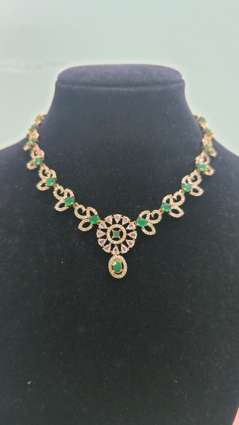 Add a touch of natural elegance to your ethnic wardrobe with our Elegant Green Stone Leaf Design Necklace Set from Sandhya Fashions.
