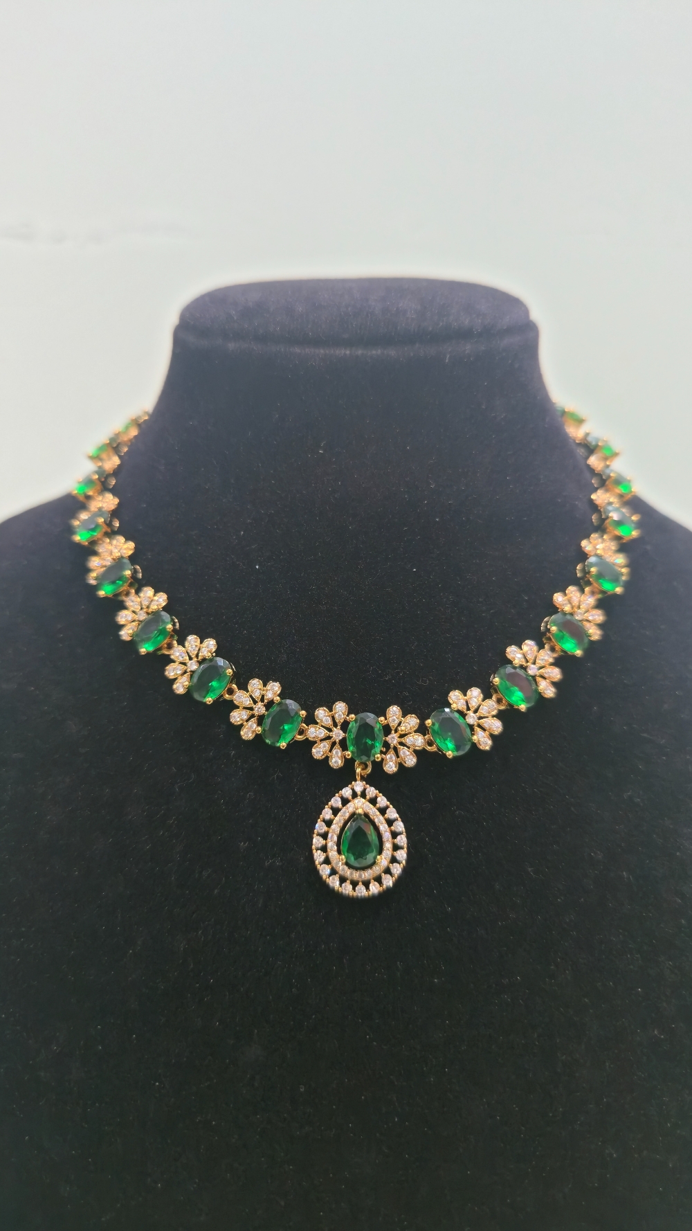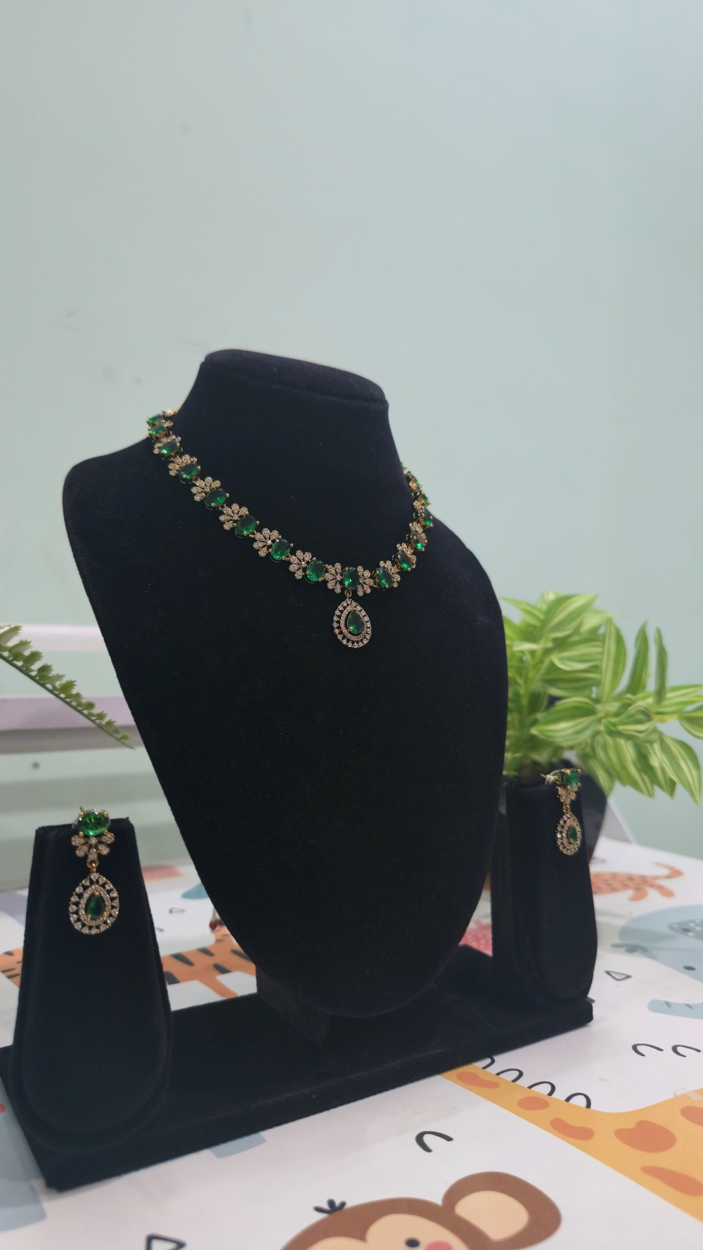 This set is designed with premium imitation craftsmanship, featuring rich mehendi polish detailing adorned with lustrous green stones that give an exquisite royal finish. The floral-inspired motifs and antique tone make it an excellent choice for festive wear, weddings, or family gatherings.